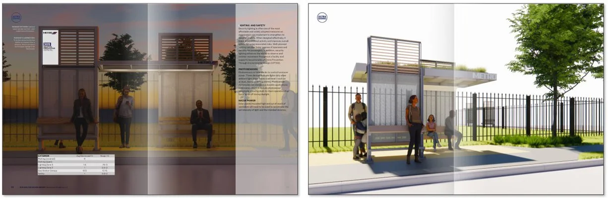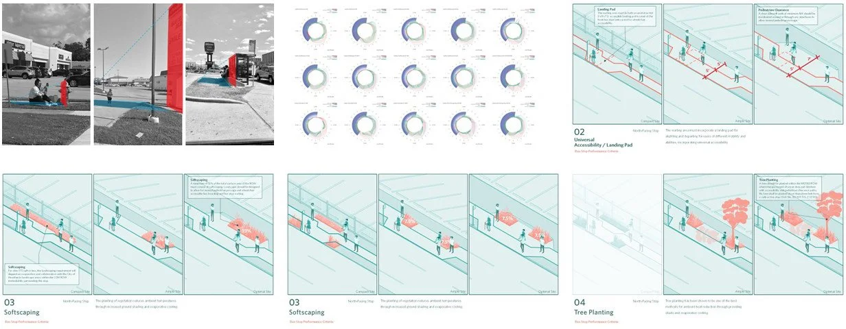 UltraBarrio team developed performance design criteria for bus stop structures and sites that respond directly to Houston’s hot, humid climate by optimizing landscape, orientation, visibility, and material choices. These strategies naturally reduce heat exposure, improve thermal comfort, and support public health by mitigating extreme temperatures at the pedestrian scale. In a city where high heat, intense sun, and prolonged summers shape daily life, thoughtfully designed bus stops can function as essential climate-responsive infrastructure — providing shade, cooling, and relief for riders while enhancing the performance, usability, and resilience of our public realm.
