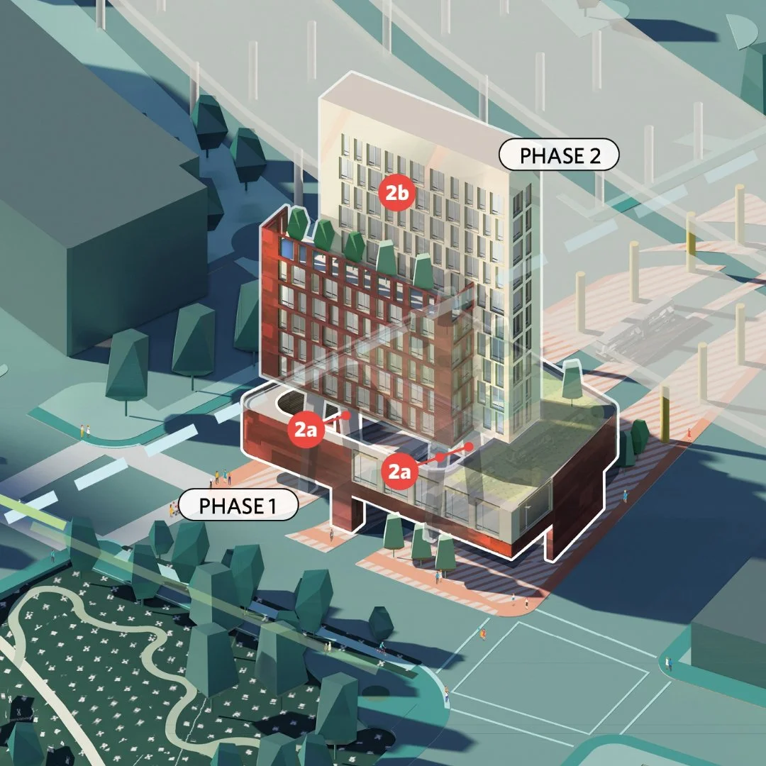 Houston's urge for public transit has historically been outpaced by suburban sprawl leaving ambiguous blocks to be recalibrated with new roles for transit sites. In the context of Houston, what if transit stops were less points in a fabric, but evoked new threads modulating scale, culture, and context? The planned 4.5 mile elevated rapid transit corridor connects the 1500 acre park thicket to the 17 block theater district initiating a collection of enhanced ground planes. The geographically distinct ribbons of trails, waterways, and neighborhoods are demonstrated throughout the transit’s guideway line. The project extends connectivity beyond the station platforms to the local ecologies and built character of the station sites. The ‘chassis’ - a nimble structure for each station transforms space into place and establishes development that is compatible with the character, demands, and scale of the city’s context, from vehicular flows to natural systems.